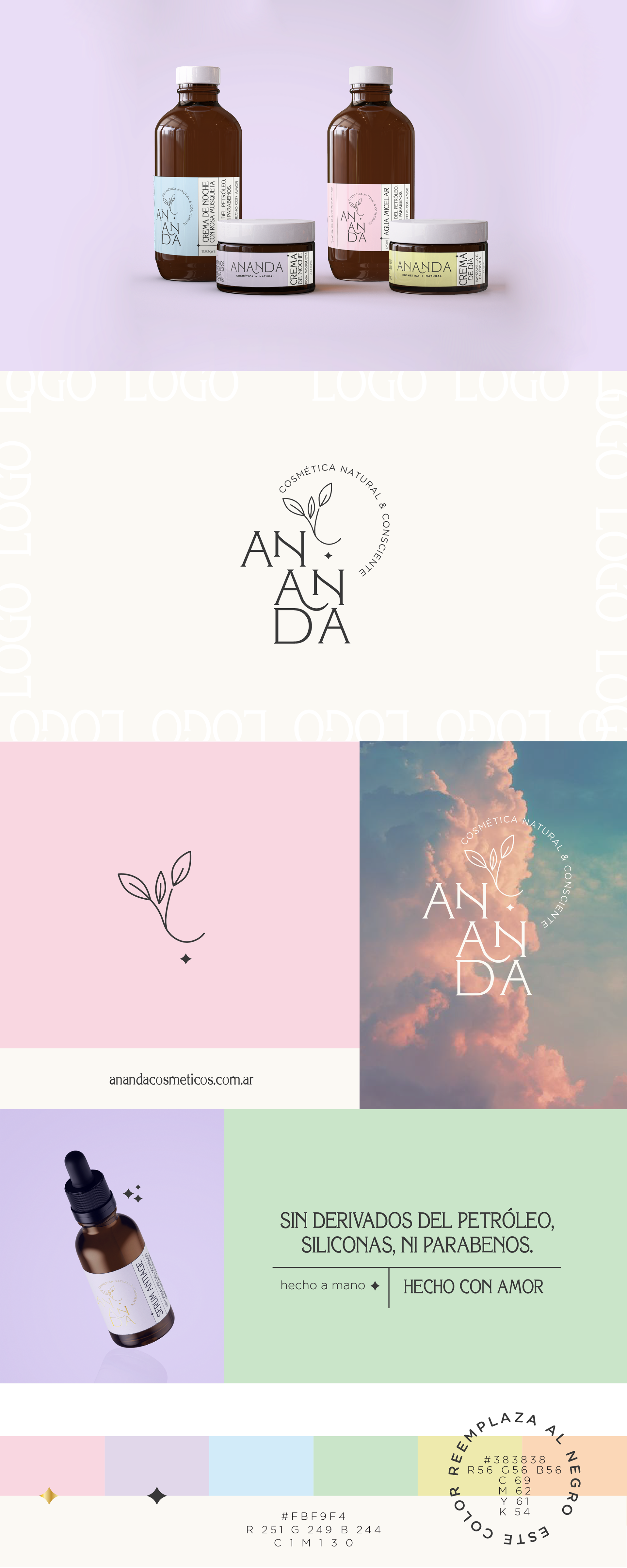 ANANDA – Branding Date: June 2020 Location: Córdoba, Argentina The Brief Ananda is an all-natural, organic skincare brand rooted in simplicity and self-care. They needed a brand identity that felt pure, calming and dreamy. The Solution I designed a soft, nature-inspired visual system with organic shapes, pastel tones, and elegant typography. The branding was applied across packaging, print materials, and social templates — reflecting Ananda’s values of balance, honesty, and conscious beauty.